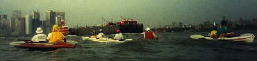 Of the twenty boats expected for the trip, eight (including my craft) were Klepper Folding Kayaks. The owners of these Kleppers arrived at 8:00 in order to assemble their boats-in-a-bag by 9:00. The currents around Manhattan alternate directions every five to seven hours. The Hudson River, on Manhattan’s west side has tidal currents ranging from two nautical miles per hour (or Knots) upstream to three knots downstream. The East River (named for its position relative to Manhattan) is actually a tidal strait between Long Island Sound and New York Bay. Here tidal currents can range between three and five knots in either direction, as the East River siphons water into or out of Long Island Sound. Since the average cruising speed for a kayak is three to four knots, knowing the timing of the currents is critical to the success of any trip around New York.